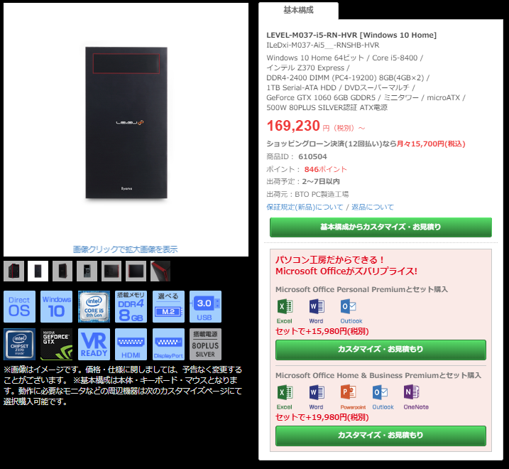 この価格だと保証部分なども含めBTOメーカーで購入した方が安い可能性もあるためご紹介しておきたいと思います。