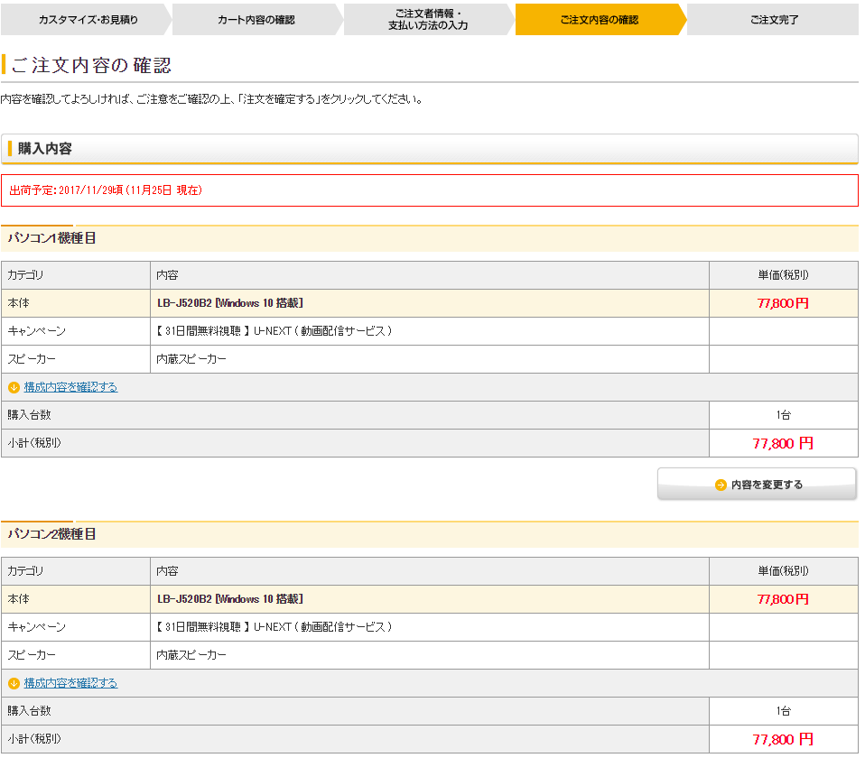 注文の確認ページまで飛んだら先ほど選んだ項目で間違いがないか確認しましょう。
