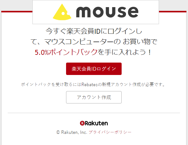 マウスコンピューター公式サイトは楽天Rebates提携企業なので右上にポイントバックの表記があります。
