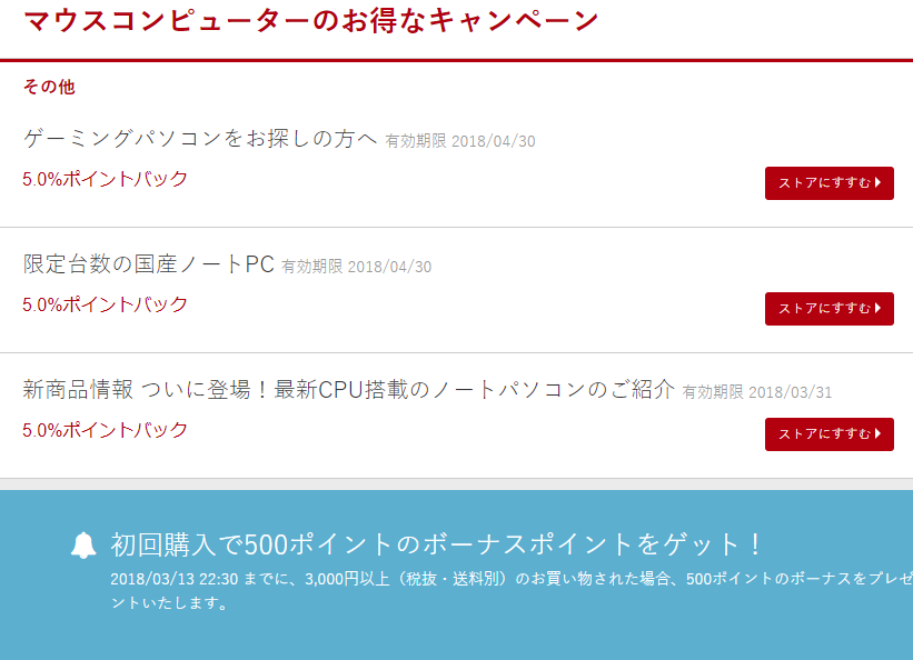 • マウスコンピューターの公式サイトのキャンペーンを確認する→3000~20000円分の本体割引