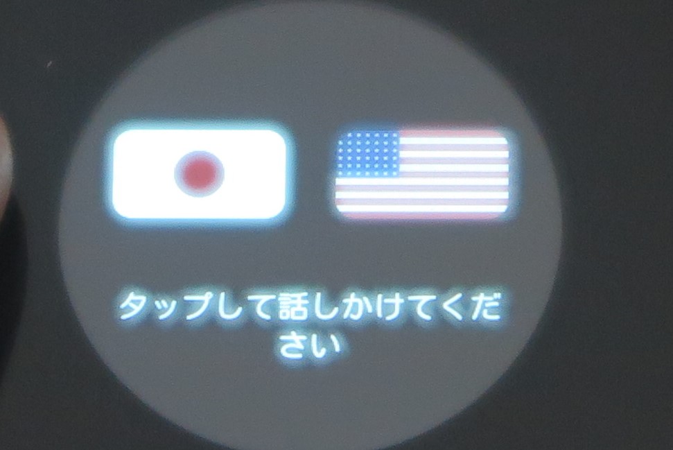 この場合、タッチパネルの←やじるしを選択し、日本語で話しかけると右側の英語に翻訳されます。