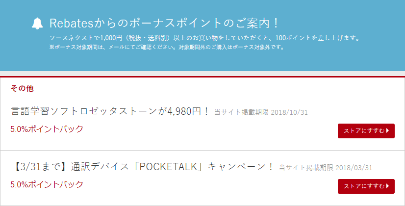 そのほか、楽天リーベイツでもソースネクストの公式ページで行われているキャンペーンも確認できます。