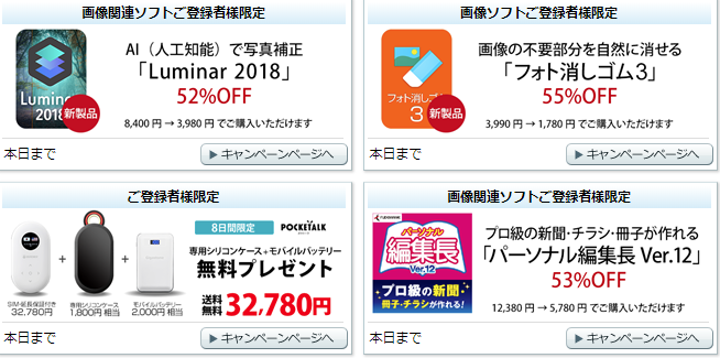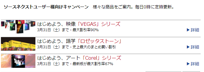 ソースネクストでは、同社が販売するソフトウェアのキャンペーン情報の表示を行っております。