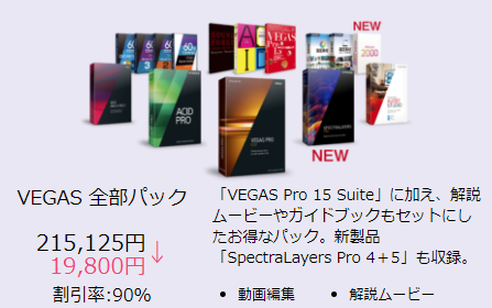 製品にもよりますが、大人気の動画編集ソフト「Vegas Pro15」シリーズでは、オーサリングソフトや音の編集ソフト、解説書など合計20万円を超えるソフトウェアのパックが90%オフで購入することができます。