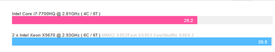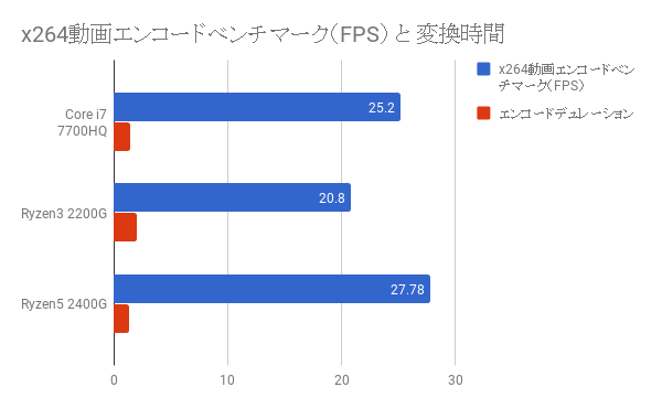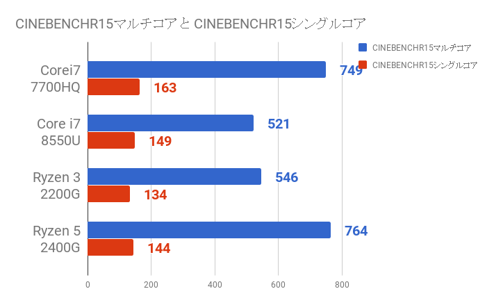 CINEBENCHおよび、x264Benchの結果からCore i7 7700HQのパフォーマンスは最近AMD社から発売された、Ryzen 3 2200G Ryzen 5 2400Gの間くらいということがわかりました。
