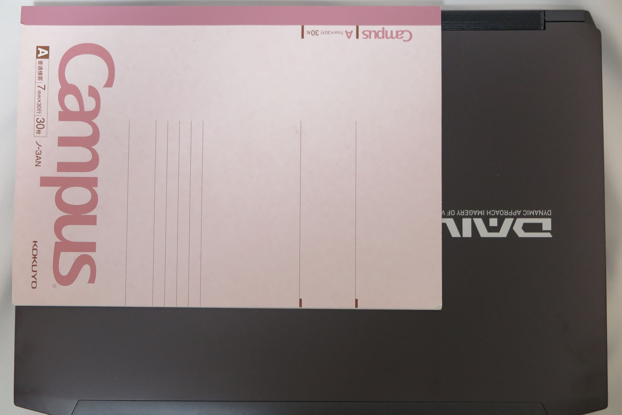 A4のキャンパスノートと比較、14インチではあるものの、他の14インチのノートパソコン比較すると、ややゴテゴテとして大きめな印象を受けます。これで携帯性を確保できるのだろうか?