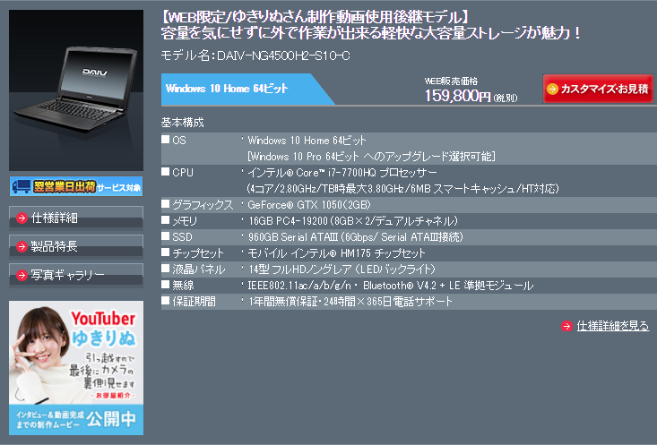 YouTuberの「ゆきりぬ」さんとコラボしたウェブ限定モデルの後継機である、DAIV-NG4500h2-s10-cに搭載されているSSDは、パソコン用ストレージ以外にも定評のあるSanDisk社製960GBモデルを採用しています。