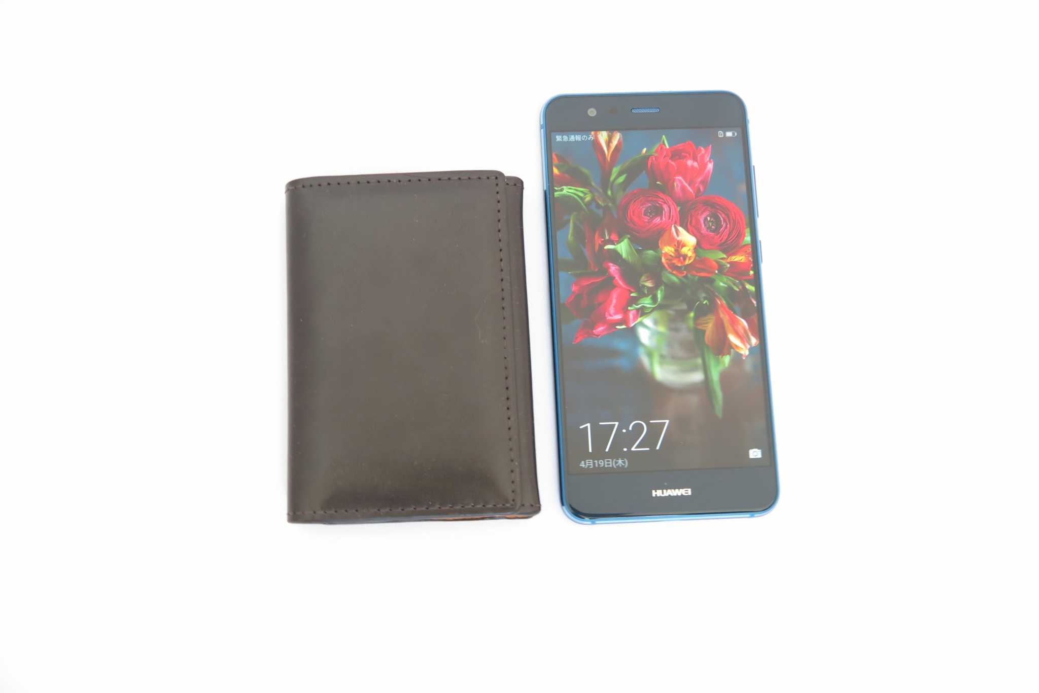 こちらは名刺入れと比較、5.2インチのスマートフォンは普段利用しているiPhoneSEよりも一回り大きいです。