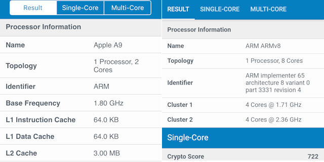 さて、非常に残念なお知らせです、CPUパフォーマンスを測る有料ベンチマークソフト「GeekBench」によると型遅れのiPhoneSEに搭載されているApple製のA9チップの方がパフォーマンスが高い。