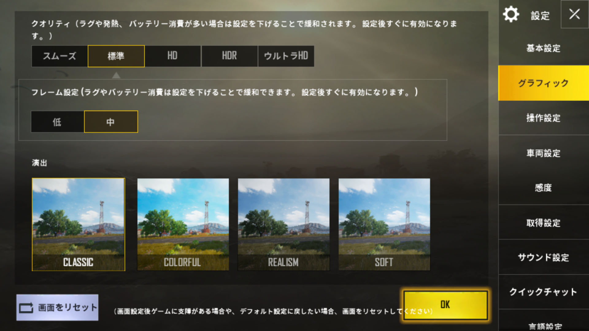 Kirin658では最適設定は快適画質(最低画質)となっています。