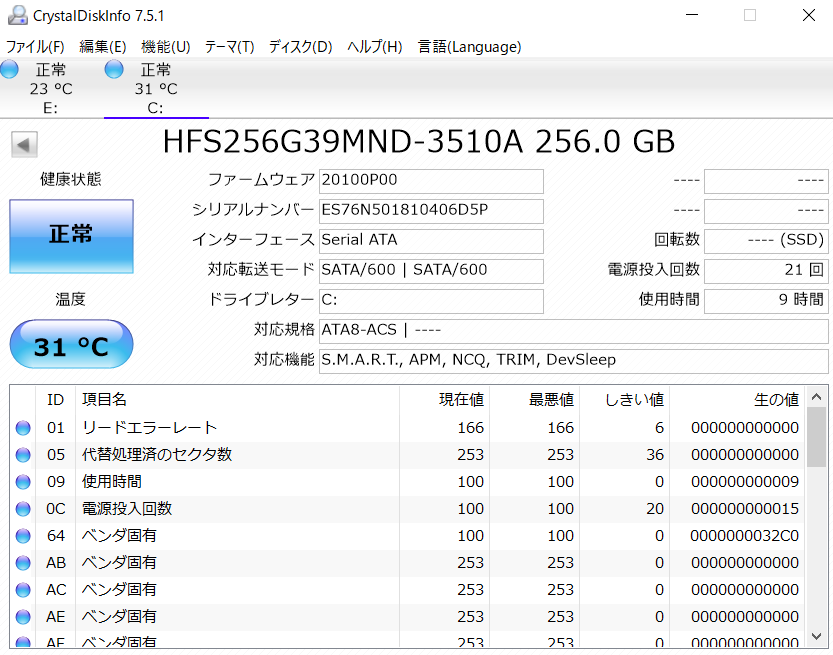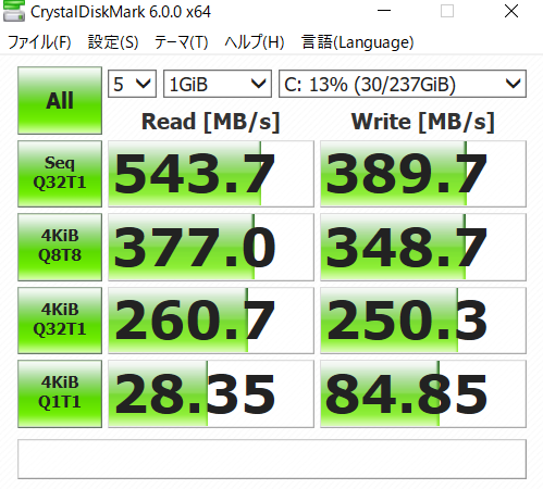 上記の実測値はクリスタルディスクインフォとクリスタルディスクマークです。