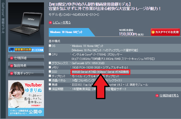 [amazonjs asin=”B01MRJLVP5″ locale=”JP” title=”SanDisk 内蔵SSD 2.5インチ / 960GB / SSD PLUS / SATA3.0 / 3年保証 / SDSSDA-960G-J26″]持運びを重視したシングルSSDの構成であり、有名YouTuber「ゆきりぬ」さんとコラボしたモデルの後継機にはSanDisk社製のSSDが搭載されています。