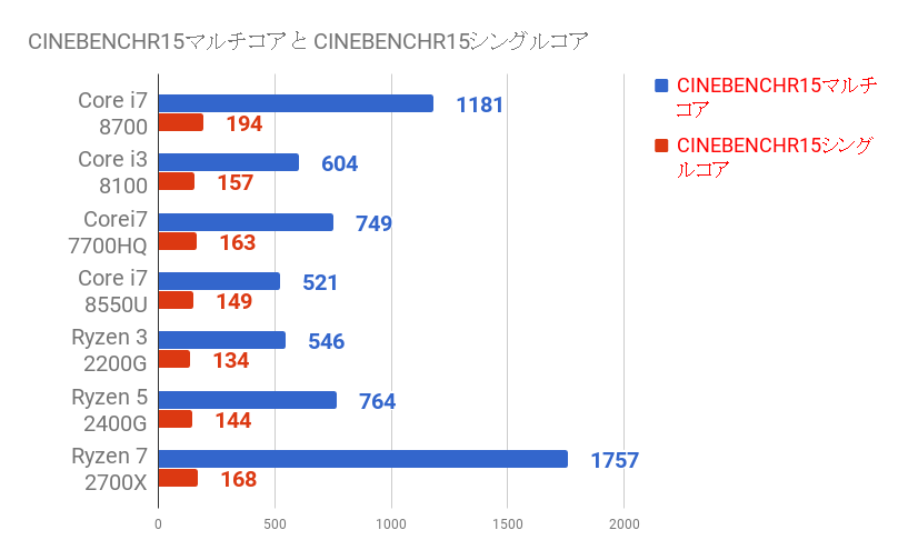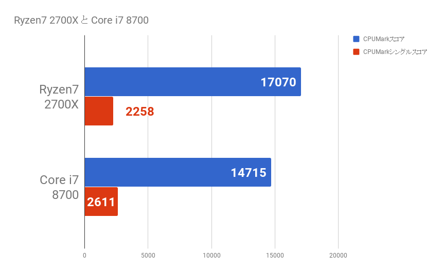 当ブログで計測している数値です。Ryzen7 2700Xと比較するとCPUパフォーマンスではやや不利といった結果が出ました。