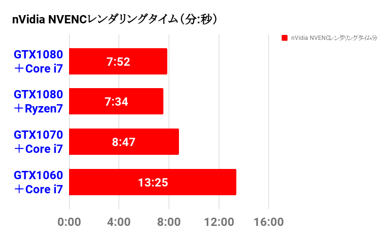 上記表は、動画編集ソフトVegasProを用いて5分程度の編集された動画をNVENCを利用してレンダリング。その際にかかる作業時間です。