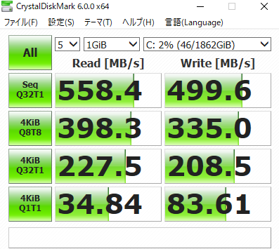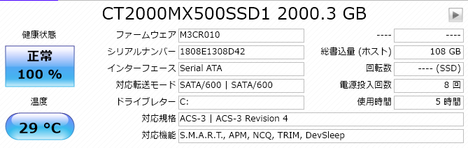 今回、2TB SSD ( Crucial MX500 / SATA3 / 6Gbps 対応 )をBTOしてみました。SSDを買うならオススメとされているクルーシャルですが、2TBでもPCIeには数値上かなわないので(あたりまえですが)やはりSSDを増設するのであれば、NVMeにしましょう。