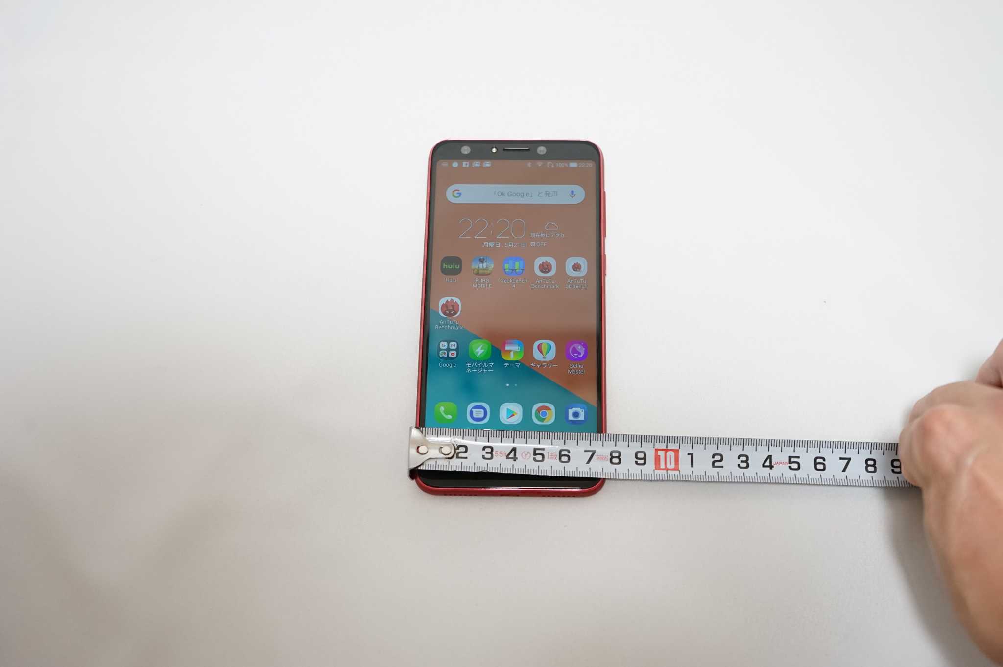 スマホの縦の長さをメジャーで計測してみたところ、メーカー公称値どおり、16.cm程度の長さでした。(正確には160.5mm)