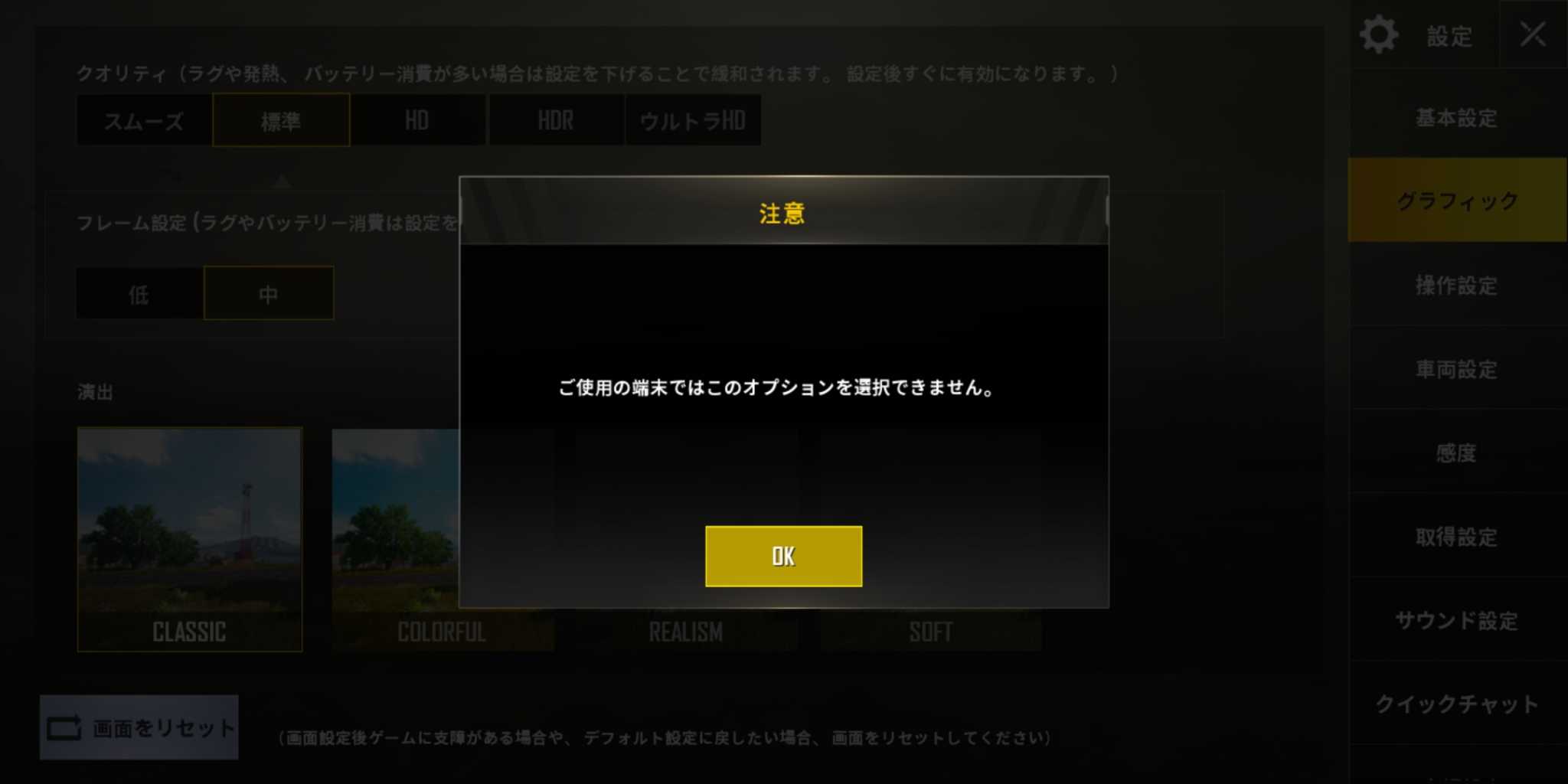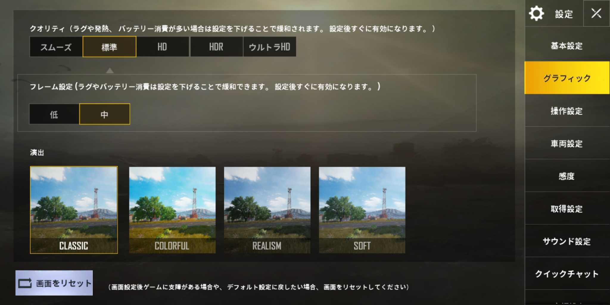スマホ版PUBGモバイルでは、スマートフォンの端末のもつパフォーマンスによってデフォルトの画質設定が変わるようになっています。