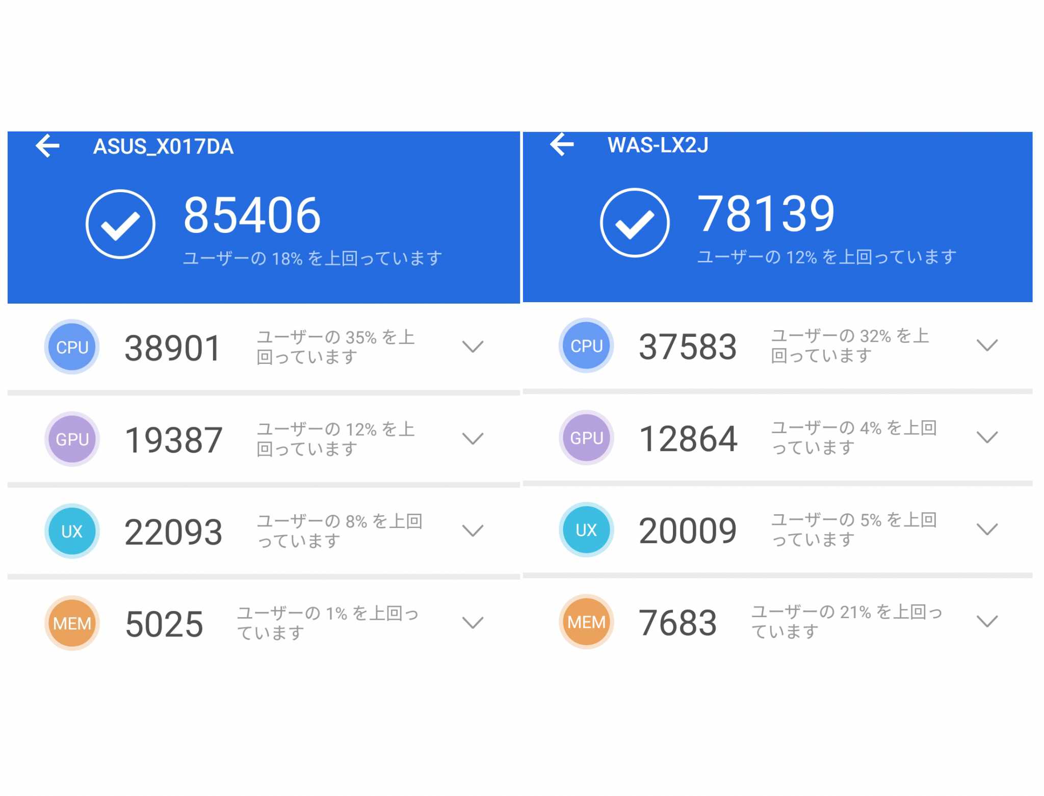 ゲームをプレイする際のグラフィックスやCPUの処理能力まで含めたトータルの処理能力を測るAnTuTu BenchmarkではZenfone5Qの方が処理能力が高いとでています。