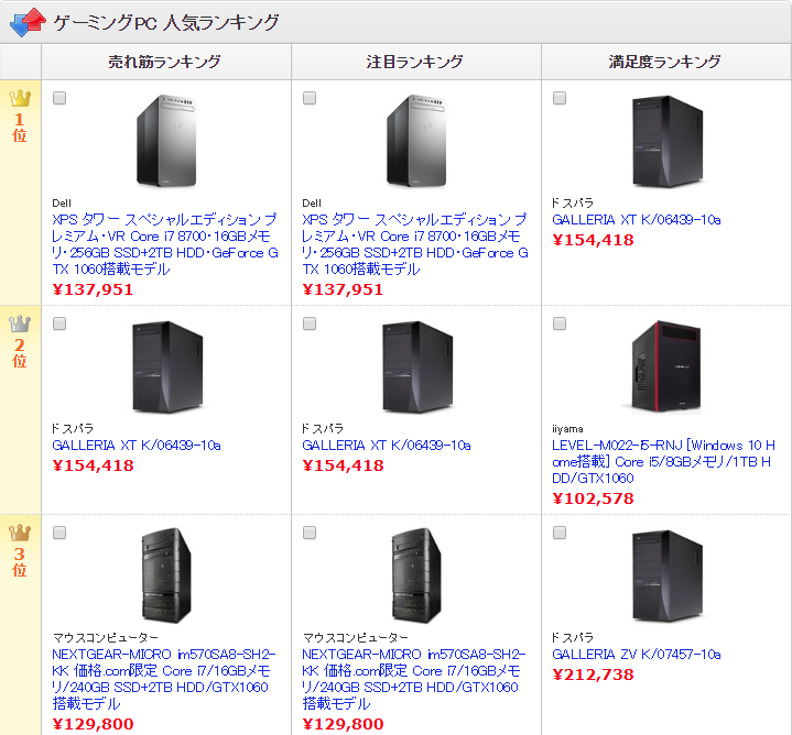 例えば、価格.comのゲーミングPCランキングでは常にマウスコンピューターやDELLが上位を占めていますが、満足度ランキングではiiyama PC(パソコン工房のデスクトップパソコン)が上位に来ます。