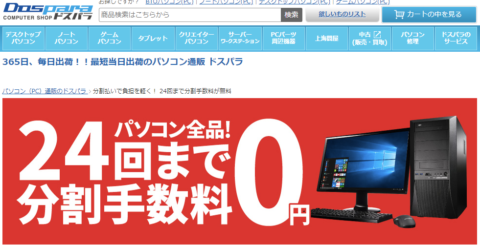 パソコン工房公式サイトで即納モデルを確認ジャックスのショッピングローンがパソコン工房は12回まで、ドスパラは24回まで無料