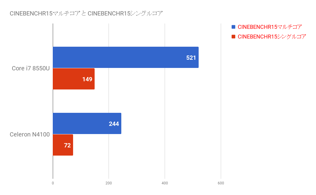 当ブログで計測した、ノートパソコンの上位ランクCPU Intel Core i7 8550Uと比較したグラフです。