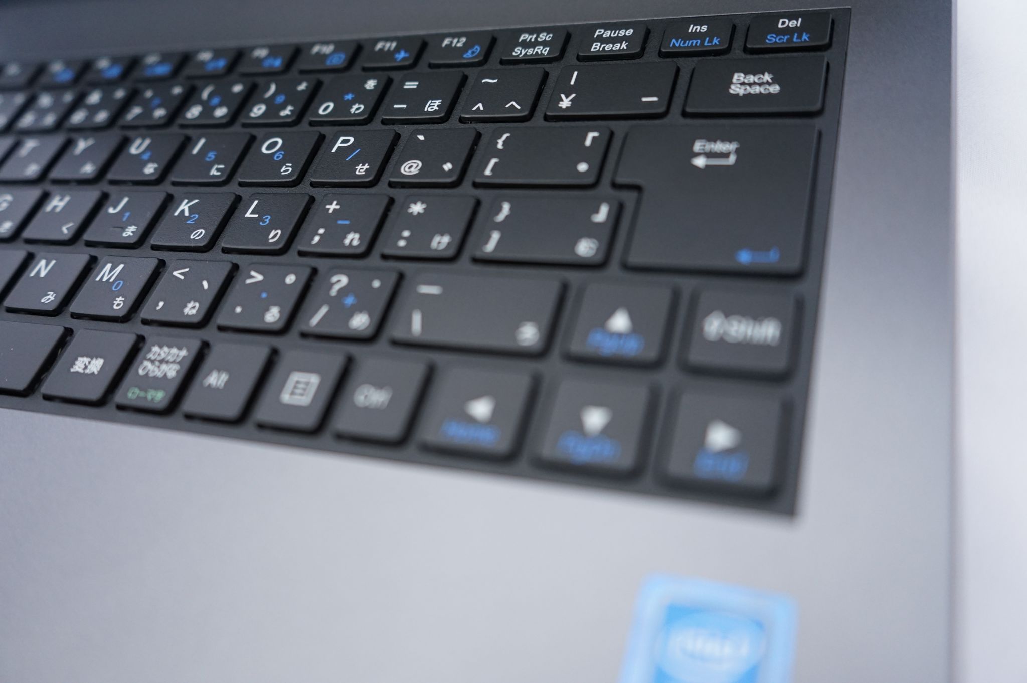 m-Book E410のキーストローク(キーの沈み込み)は18mm、キーピッチ(キーとキーの間隔)18.75mmとタイピングしやすいサイズ感です。