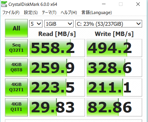 ADATAのSSDはSATA接続の限界値付近の読込速度。シーケンシャルリードは558.2MB/s です。