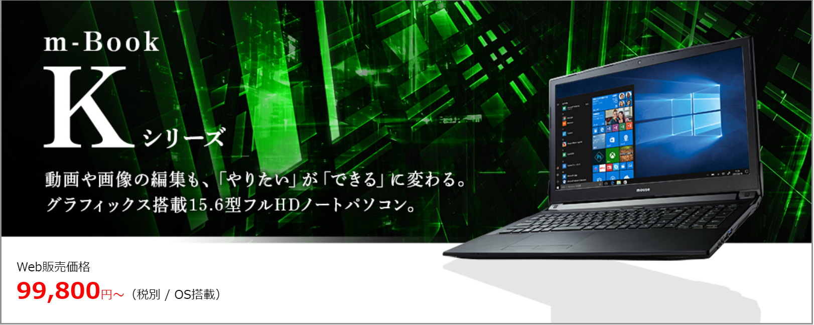動画の編集から、画像の編集などのクリエイティブな作業はあふれでるCPUパワーを使って快適に行うことができるm-Book K690シリーズの価格は最廉価モデルで99,800円(税抜き)。