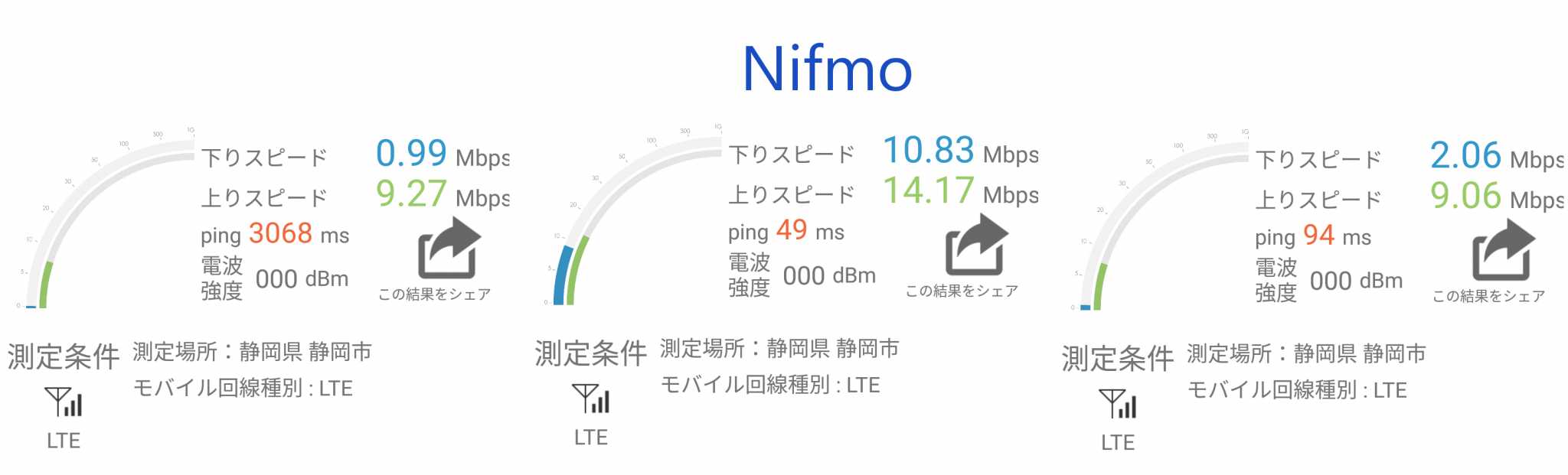 | Nifmo | 0.36Mbps | 0.53Mbps | 16.3Mbps | 5.73Mbps |