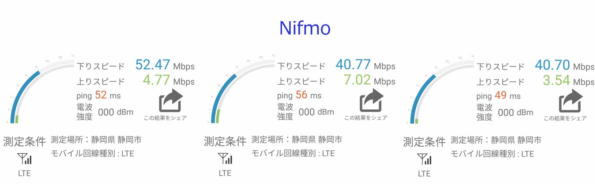 | Nifmo | 52.47Mbps | 40.77Mbps | 40.70Mbps | 44.64Mbps |