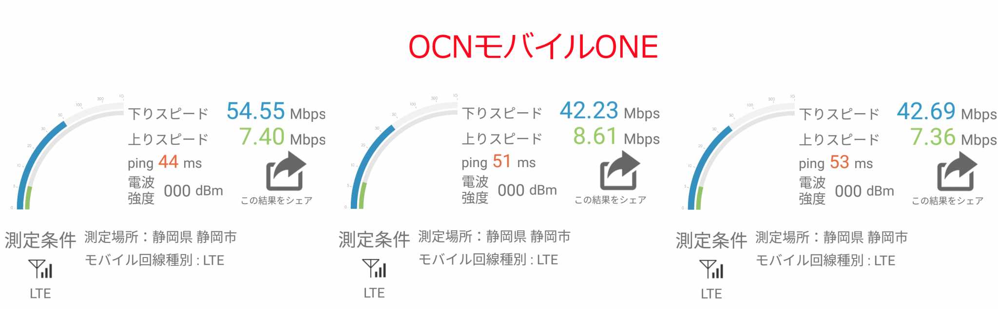 | OCNモバイルONE | 54.55Mbps | 42.23Mbps | 42.69Mbps | 46.49Mbps |