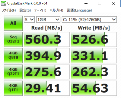 SANDISKの512GBのSSDを搭載していました。シーケンシャルリードは560Mbsと快速です。