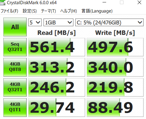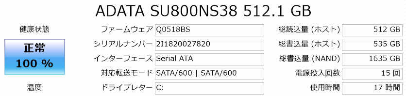 m-Book B506Hに搭載されるM.2規格のSSDはADATAのSU800を搭載しています。SATA接続ではあるものの読込速度は高速です。