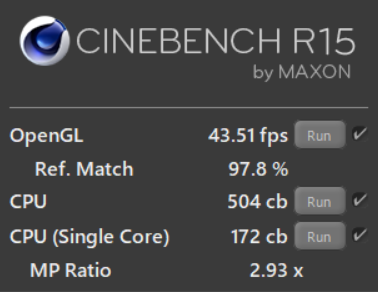 CPUの性能をテストするCINEBENCH R15ではマルチコアのスコアが504でした。