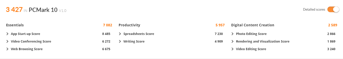 パソコンのトータルパフォーマンスを測るPCMARK10では、3427という数値でした。