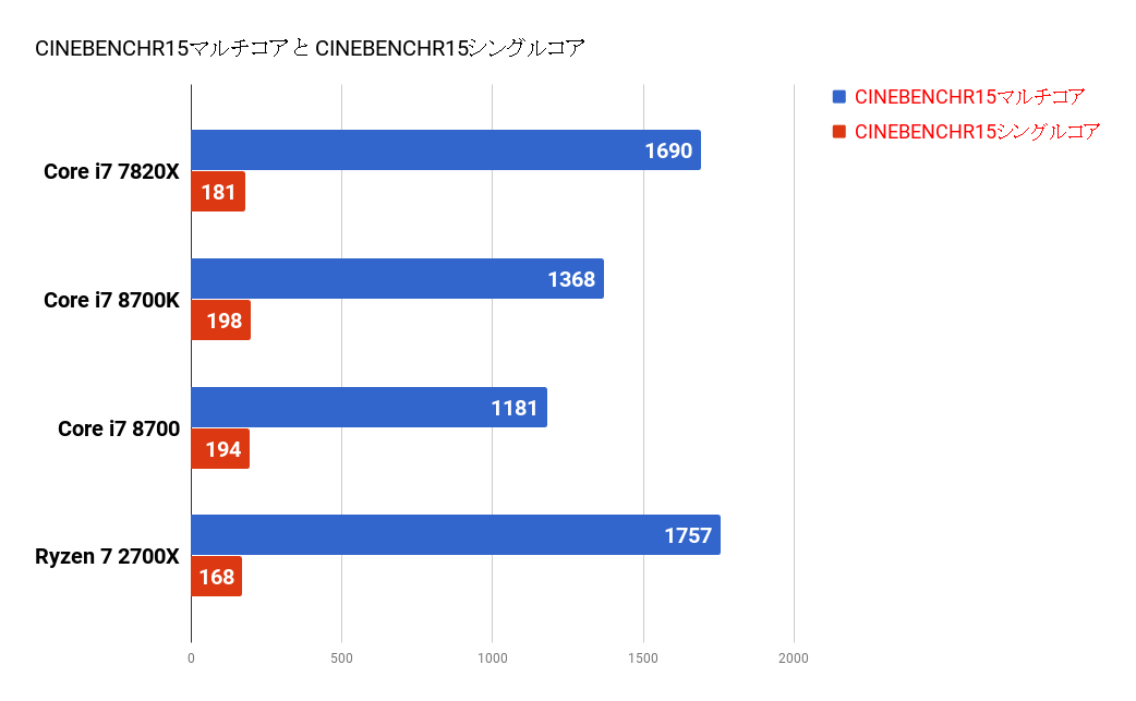 とはいえ、シングルコア性能では以前インテルCPUが有利で、特にCore i7 8700K及び8700との差が顕著に出ています。(当ブログ計測データ)