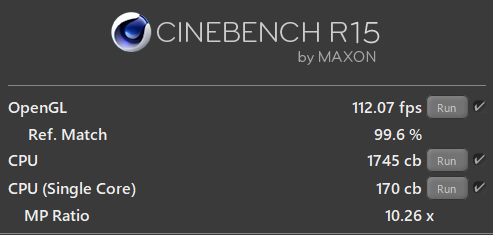 CPUのパフォーマンスを測定するCINEBENCH R15では上記のような結果に。