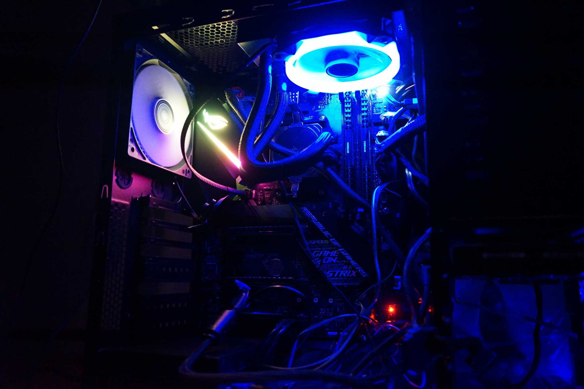 備え付けのCPUクーラーでも十分な冷却性能を発揮してくれますし、純正で七色に光るのは見ていて気持ちがいいものです。下記は簡易水冷のCPUクーラーをつけた写真です。