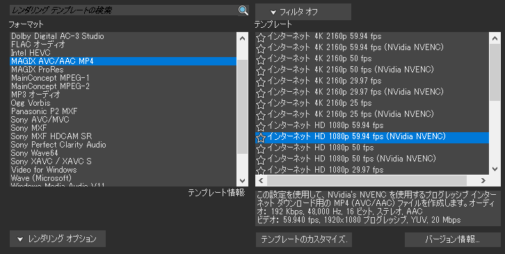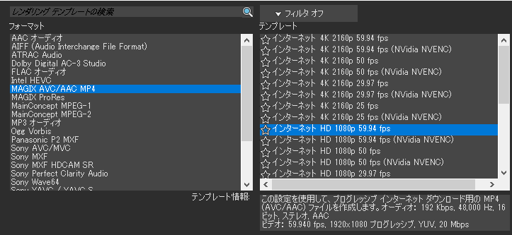 動画制作ソフト『Vegas Pro15』を用いて5分程度のmp4+(テロップ、BGM付)動画をMAGIX AVC/AAC MP4フォーマットの『インターネットHD 1080P 59.94』に変換してます。(画像が誤りです)