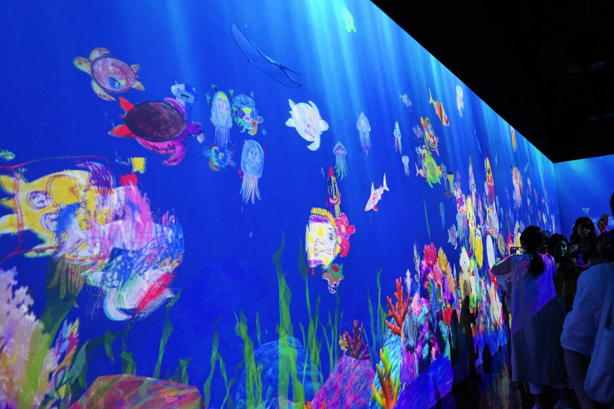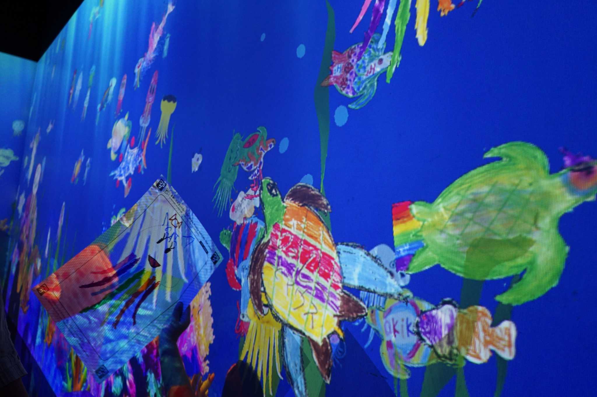 館内は、鑑賞するものはもちろんのこと、おなじみの魚の絵をかいて壁に投影する体験型スポットとしてもお子さんづれの方が多くいました。