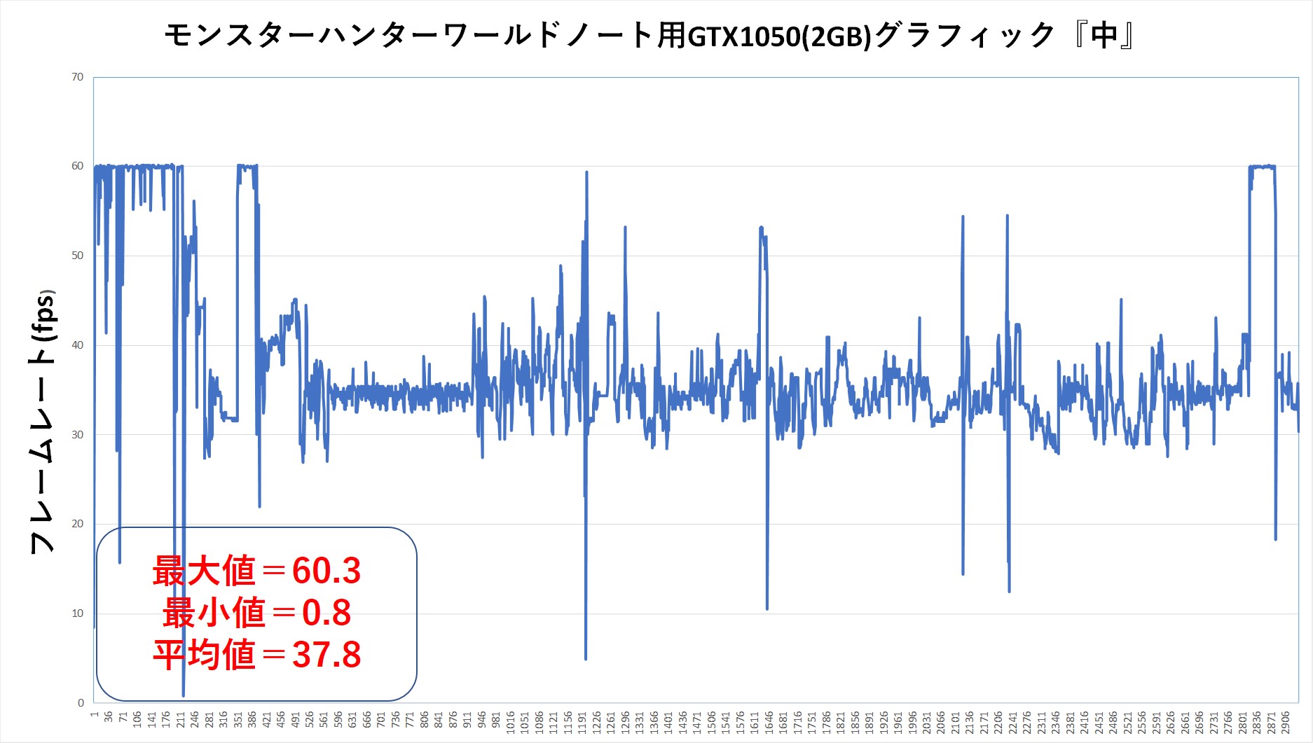 プレイ中はさほど気にならなかったのですが、改めてエクセルでフレームレートを書き直してみるとかなり荒れてますね。