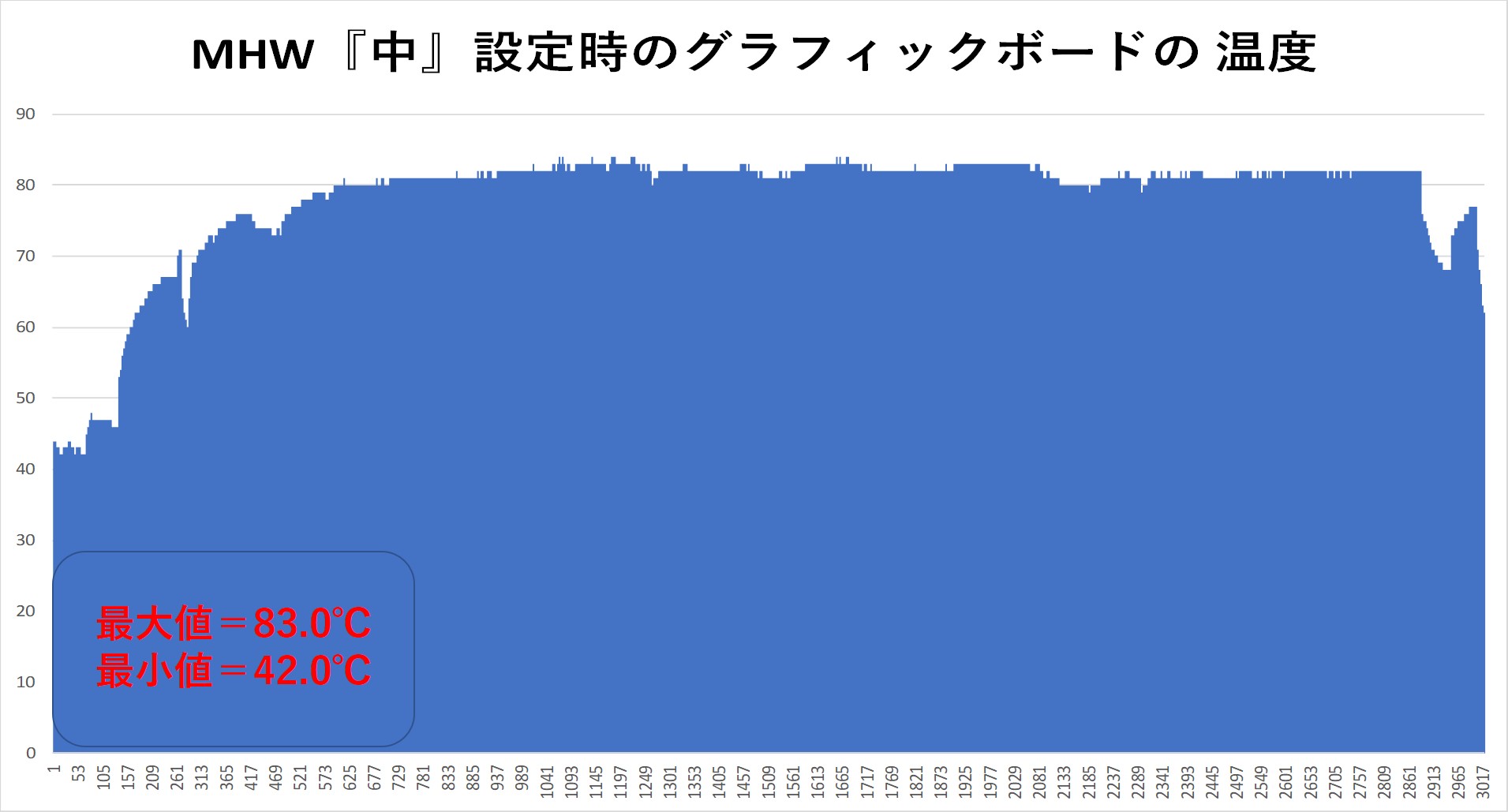 実は『中』設定からトライしたので出だしのGPU温度は『中』の方が低かったりするのですが、最高温度は『中』の方が7℃も高いという状態に。
