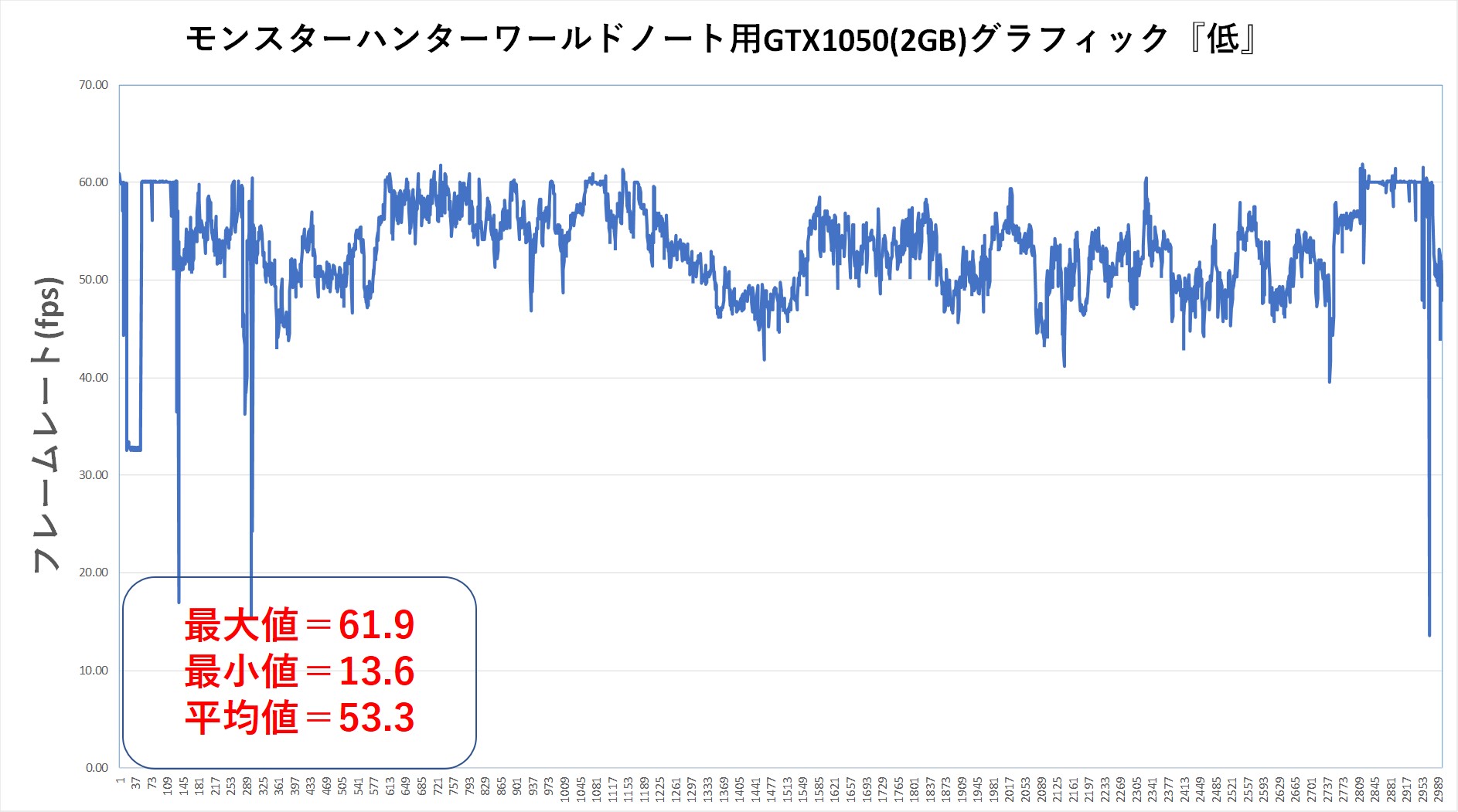 グラフィック設定低のフレームレートは上記グラフのような感じでした。