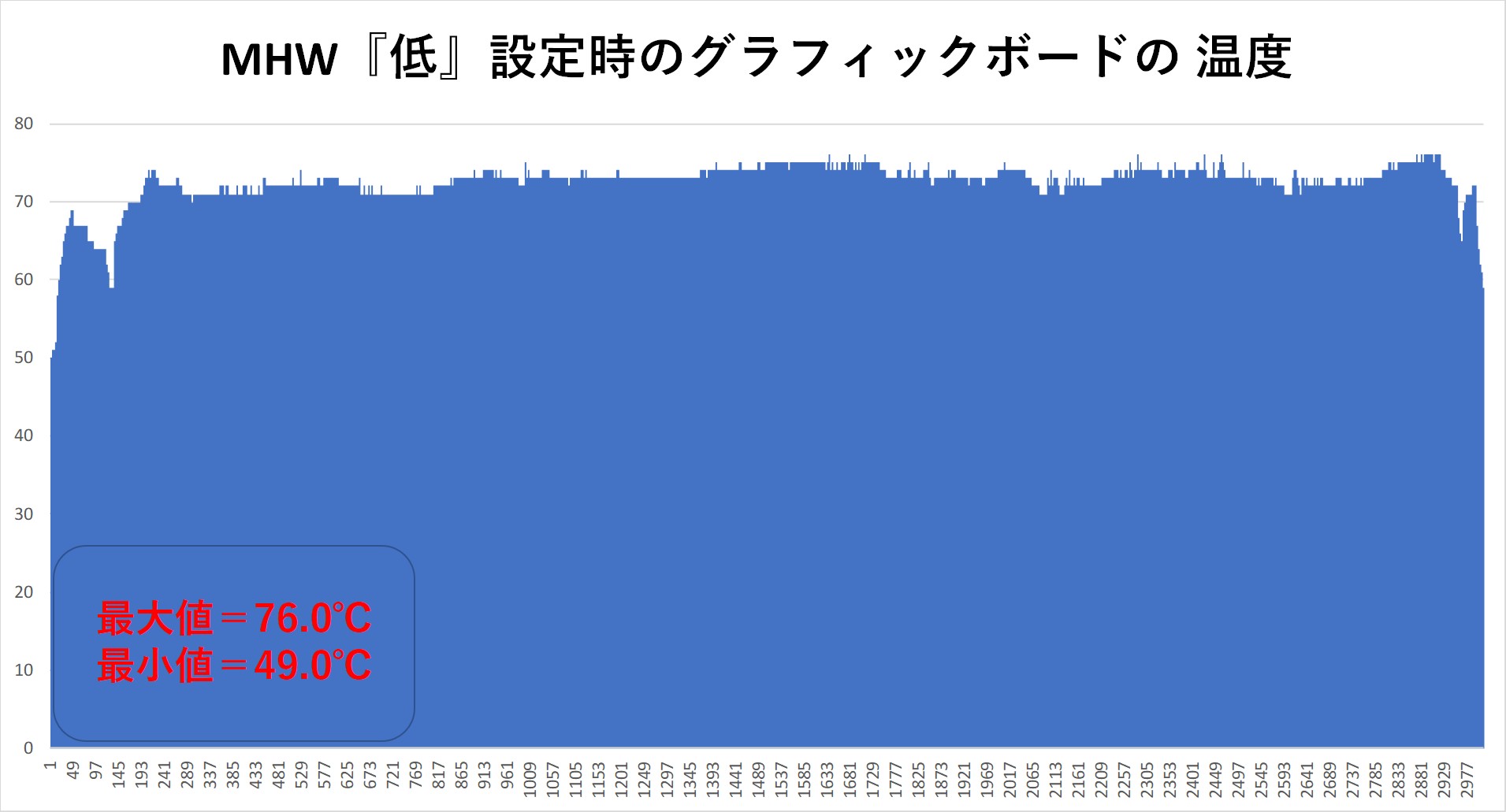 GTX1050でMHWのグラフィック設定『中』でプレイはおすすめしない。グラボの熱が『低』と比較して10℃近く高い。