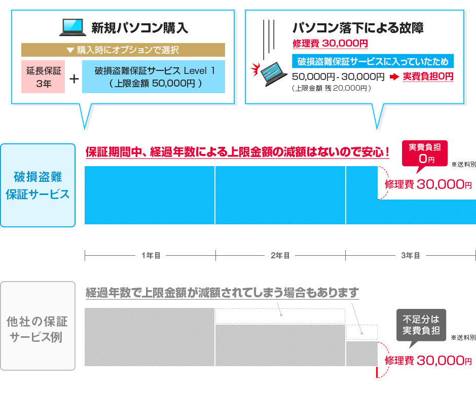 破損盗難保証サービスは、加入製品(つまり購入したパソコン)の保証期間中に起きた故障について保証上限金額を超過しない限り回数制限なく修理を行うというもの。
