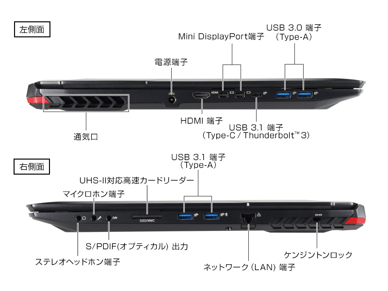 | インターフェース | USB3.1 (Type-A/ ×2、Type-C/ ×1)USB3.0×2,HDMI×1,MiniDisplayPort×2,SDカードスロット,ヘッドホン出力,マイク入力,S/PDIF |