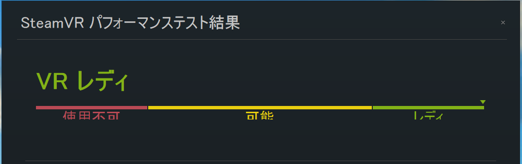 パソコンのゲームプラットフォームSteamが無料公開しているSteam VRパフォーマンステストでは、VRがプレイできるかどうかの基準『レディ』を指しています。VRプレイも快適に行うことができます。