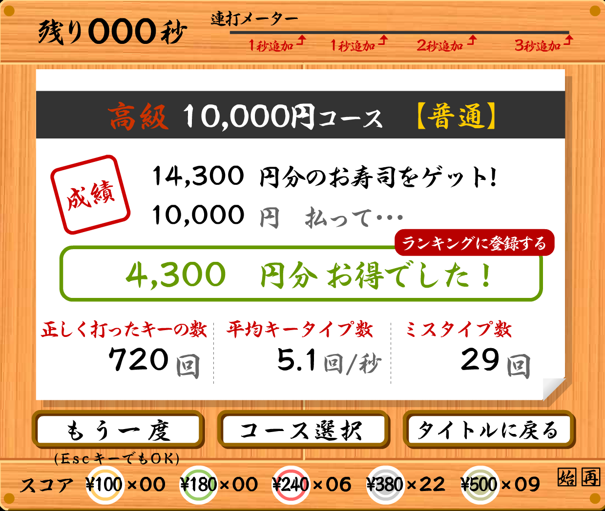 実際に寿司うちタイピングをしてみるとデスクトップ用キーボードでタイプした時と同じくらいのスコアが出ました。(僕のタイピングレベルは普通レベルです。)