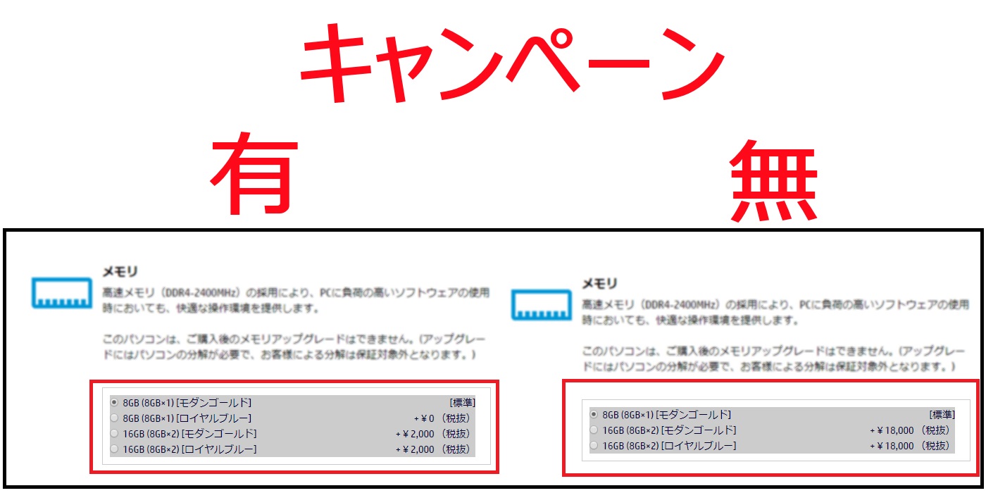 通常モデルのメモリをアップグレードした場合と、キャンペーンで2000円でアップグレードする場合差額が16000円分キャンペーンモデルの方がお得になるということです。