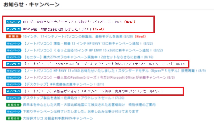 HP Directplusのページの下の方にキャンペーン情報および新商品を知らせる「お知らせ・新着情報」一覧があります。